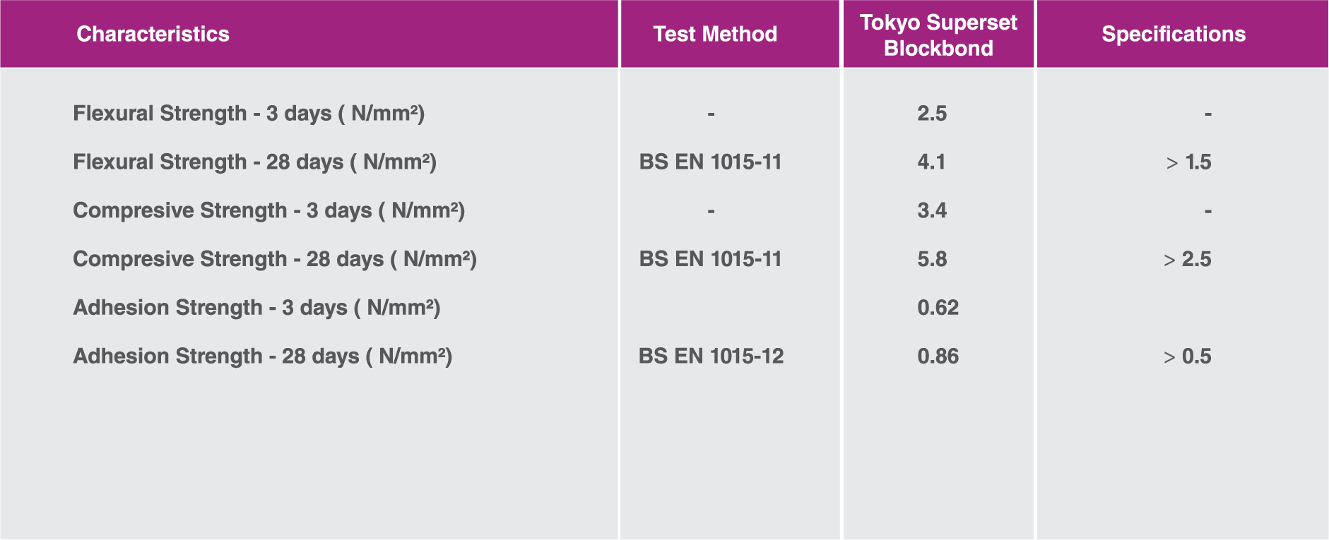 - Tokyo Superset Block Bond is self-curing and does not require water-curing post application.